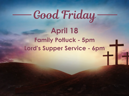 Bring a dish to share as we fellowship together at our family potluck dinner at 5pm, immediately followed by the church service at 6pm where we will observe the Lord's Supper.